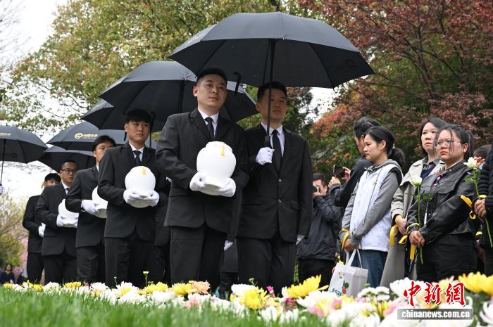 3月28日,任务职员为邓成芬、胡孝仄、孔邦死、吴少华、周光仄、周江涛6位尸身捐募者举办了“光彩归家”埋葬典礼。中新社记者 王刚刚 摄
