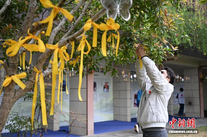 3月28日,举动到场者将黄丝带系正在“人命树”上。中新社记者 王刚刚 摄